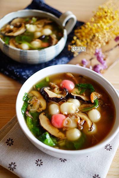 小匙鹽巴,可以幫助湯圓更快入味,水滾後放入湯圓,煮至浮即可撈起,別煮太久以免湯圓爛了,再放入已烹調好的湯底中略攪勻。7.